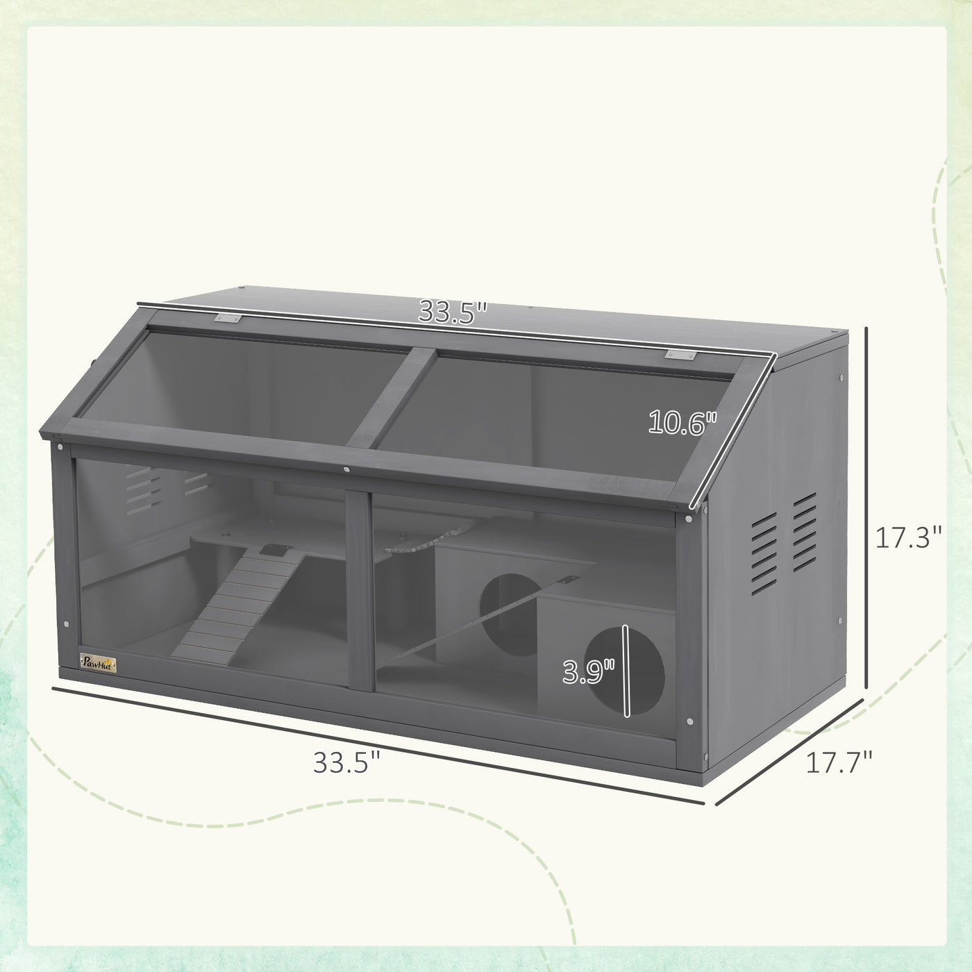 Create a captivating world for your hamster with our [BRAND NAME] hamster cage. The spacious design allows for wood shavings, letting your furry friend burrow and play. Complete with a suspension bridge, hut, ladders, and platform, it offers endless fun and exploration. The openable top door provides easy access and has a place to store hamster essentials. Give your pet a cozy home filled with adventure and excitement. Elevate their happiness with our charming wooden rat cage.