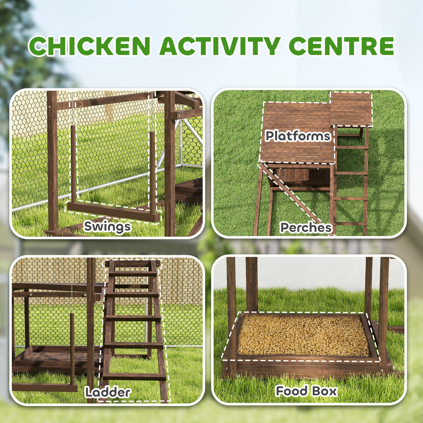 Elevate your chickens' playtime with the PawHut Chicken Activity Shelf! Featuring multi-level chicken roosting bars to strengthen legs and a swing for enhancing balance, this chicken perch offers a scenic view and cozy resting platforms. Crafted from smooth, solid wood, it integrates seamlessly with chicken cages, supporting 4-6 chickens for a lively and enriched space. Features: - Multi-level chicken ladder strengthens chicken leg and foot muscles - Swings enhance chicken coordination and balance - Chicken perch and platforms offer comfortable resting with a good view - The food box provides a spot for chickens to replenish their energy - Solid wood material supports more weight and natural movement - Polished wood prevents foot injuries in chickens - Compatible with chicken cages to enrich living space - Assembly is required, and it is suitable for chickens of 4-6. Specification: - Color: Coffee - Material: Fir Wood - Overall Dimensions: 60.2" W x 39.4" D x 37.4" H - Ladder Dimensions: 53.1" L x 12.2" W - Platform Dimensions: 26" L x 26" W, 22.8" H(off the ground)(upper), 14.6" L x 14.6" W, 29.1" H (off the ground)(lower) - Swing Dimensions: 20.1" W x 11.8" H, 7.9" H (off the ground) - Perch Dimensions: 37.8" L x 1.2" W x 1.2" D - Food Box Dimensions: 24.6"L x 24.6"W x 2.8"H - Weight Capacity: 44 lbs. - Item label: D51-471V00CF Package Includes: - 1 x Chicken Activity Shelf - 1 x Swing - 1 x Ladders - 1 x Platform - 1 x Food Box - 1 x Manual Elevate your chickens' lifestyle with the PawHut Chicken Activity Shelf! It features dual multi-level chicken ladders for leg and foot exercise, perches for panoramic views, and chicken swings to enhance coordination and balance. Crafted from polished solid wood, it ensures a natural and safe space for your chickens. Suitable for integrating into chicken coops and keeping 4-6 chickens engaged and healthy. Features: - Swings aid in improving chicken coordination and balance - Multi-level chicken ladders enhance leg and foot exercise for chickens - Chicken roosting bars offer panoramic views, promoting alertness - Solid wood ensures durability and natural comfort - Smooth finish prevents foot injuries in chickens - Compatible with chicken cages to reduce boredom - Assembly Required. Specification: - Color: Coffee - Material: Fir Wood - Overall Dimensions: 60.2" W x 38.6" D x 37.4" H - Ladder Dimensions: 34.6" L x 11" W - Platform Dimensions: 13.4" L x 13.4" W , 26.4" H (off the ground) - Swing Dimensions: 21.7" L x 12.2" W , 8.7" H (off the ground) - Perch Dimensions: 24" L x 1.2" W x 1.2" D - Weight Capacity: 44 lbs. - Item label: D51-472V01CF Package Includes: - 1 x Chicken Activity Shelf - 2 x Swings - 2 x Ramps - 1 x Platform - 1 x Manual.